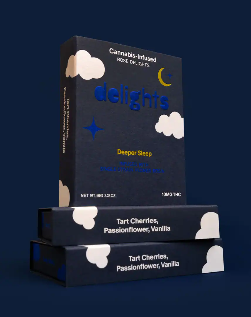 Calming tart cherry juice meets soothing passionflower and warm, comforting vanilla for Deeper Sleep, our 10mg THC + 4mg CBD snooze-inducing Delight. For this higher dose addition to the Sleep THC category, we mobilize the naturally occurring melatonin in tart cherries to support the effects of our indica-dominant sun-grown flower rosin. It’s a Delight designed to aid sleep without the use of pharmaceuticals, so you can fall asleep, and stay asleep, naturally.
