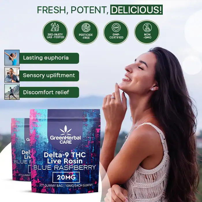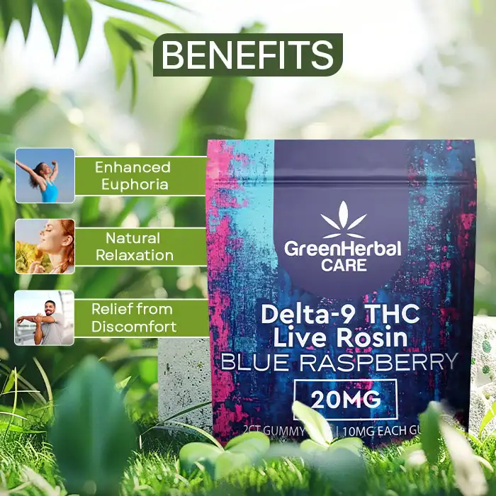 Enjoy the perfect dose with GHC Delta-9 THC Live Rosin Gummies in a 2CT Gummy Bag, featuring 10mg of premium full-spectrum Delta-9 THC per gummy. Discreet, flavorful, and ideal for relaxation or inspiration on the go!